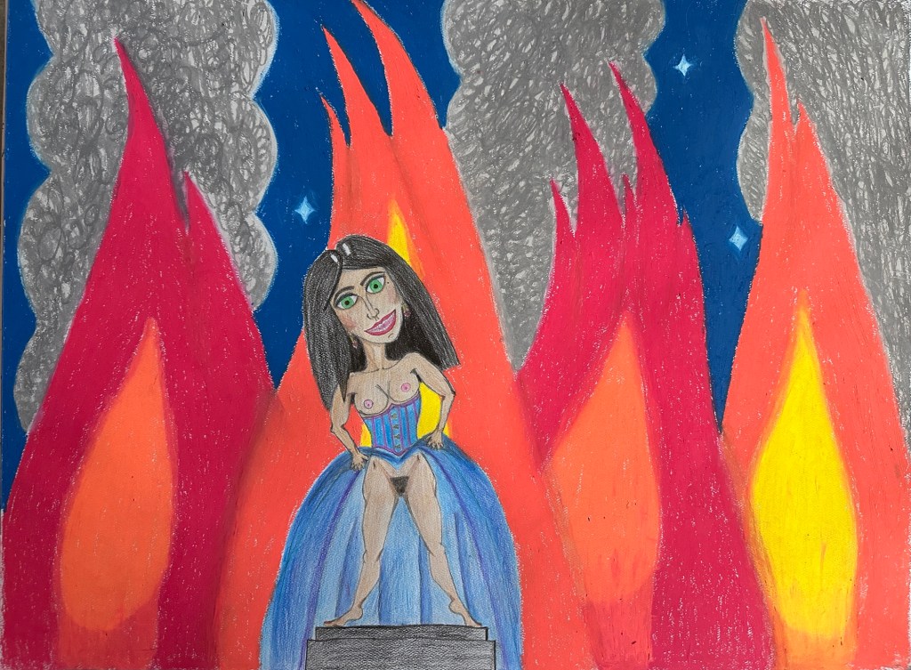 For one of my pastel pieces, I was really inspired by the various myths, through various cultures, about ana-suromai. Ana-suromai is the act of lifting up one’s skirts to flash vulva in order to lighten the mood during trying times. As far as I’m aware, there are 3 ancient goddesses from different cultures and religions, who employed ana-suromai when things were dire!